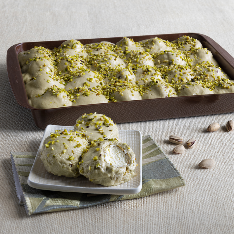 Заварные пирожные, наполненные кремом со вкусом ванили, покрытые насыщенным сицилийским фисташковым кремом и украшенные рублеными фисташками